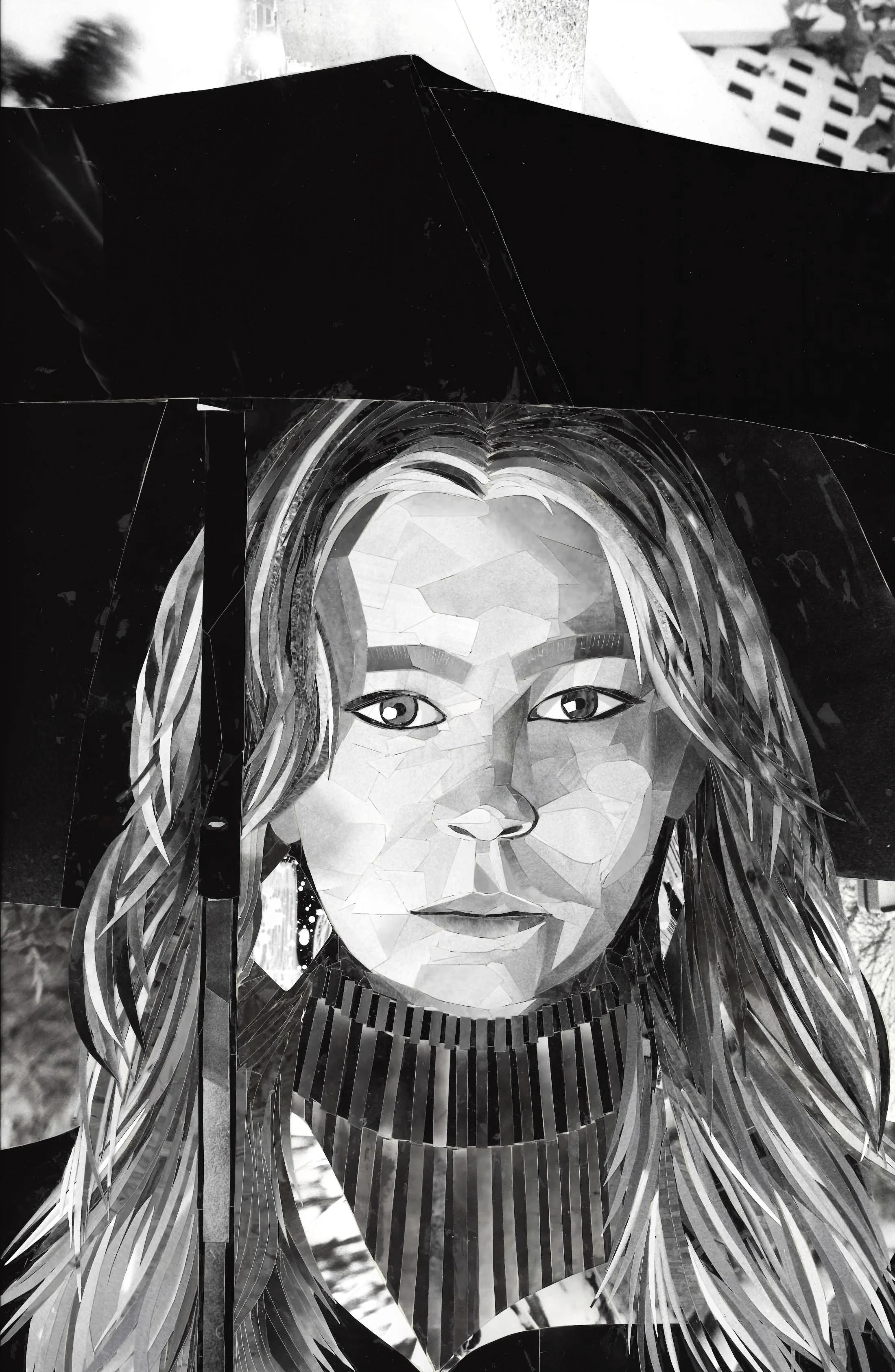 This is a black and white collage created over the course of two years out of darkroom print scraps, based on an image Norah had taken shortly before of her sister Chloe. Norah worked as a teacher’s assistant for her high school’s art teacher. She assisted in all types of tasks, but her favorite was managing the darkroom. She utilized her down time to create this large collage from the scraps that other students had discarded.