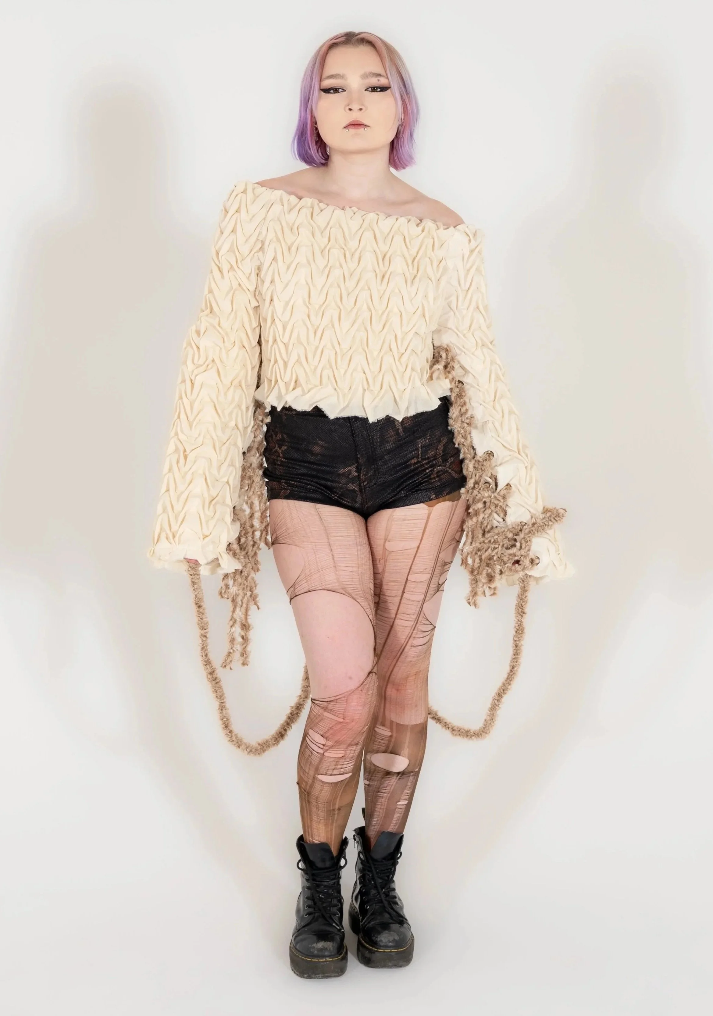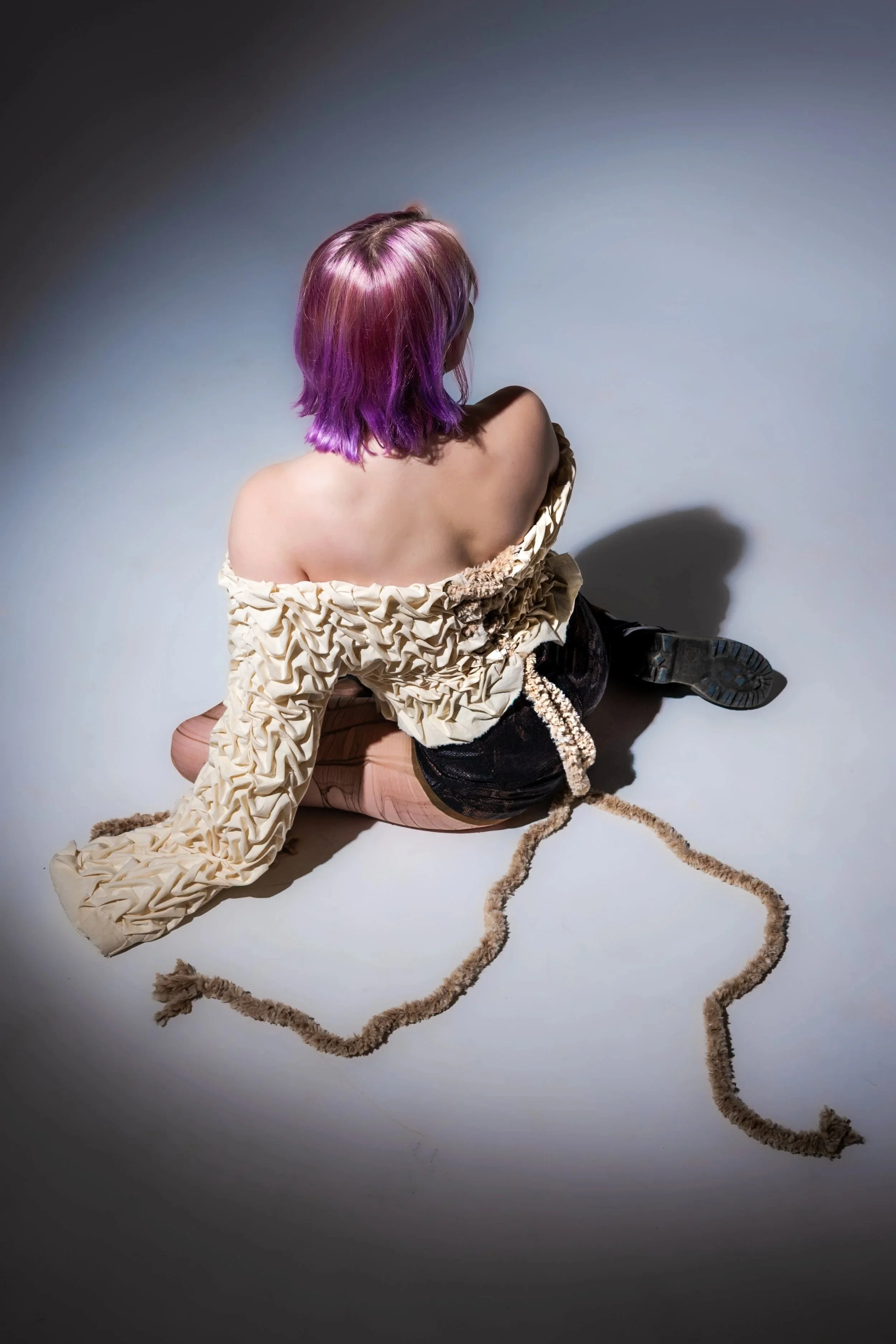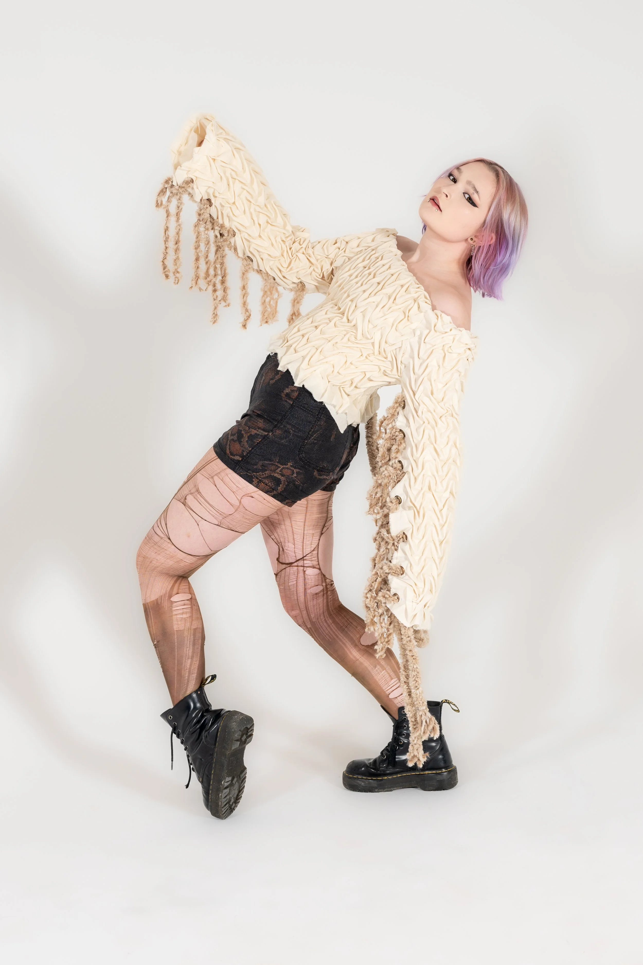 This piece includes smocking, muslin lining, eyelits/grommets, corseted with fur yarn, and superglue (to keep the stitches from popping). While it is not practical to wear due to the limited mobility and discomfort of the superglue, it was a wonderful hands-on experience. This piece was a tedious process but so satisfying to see from start to finish.