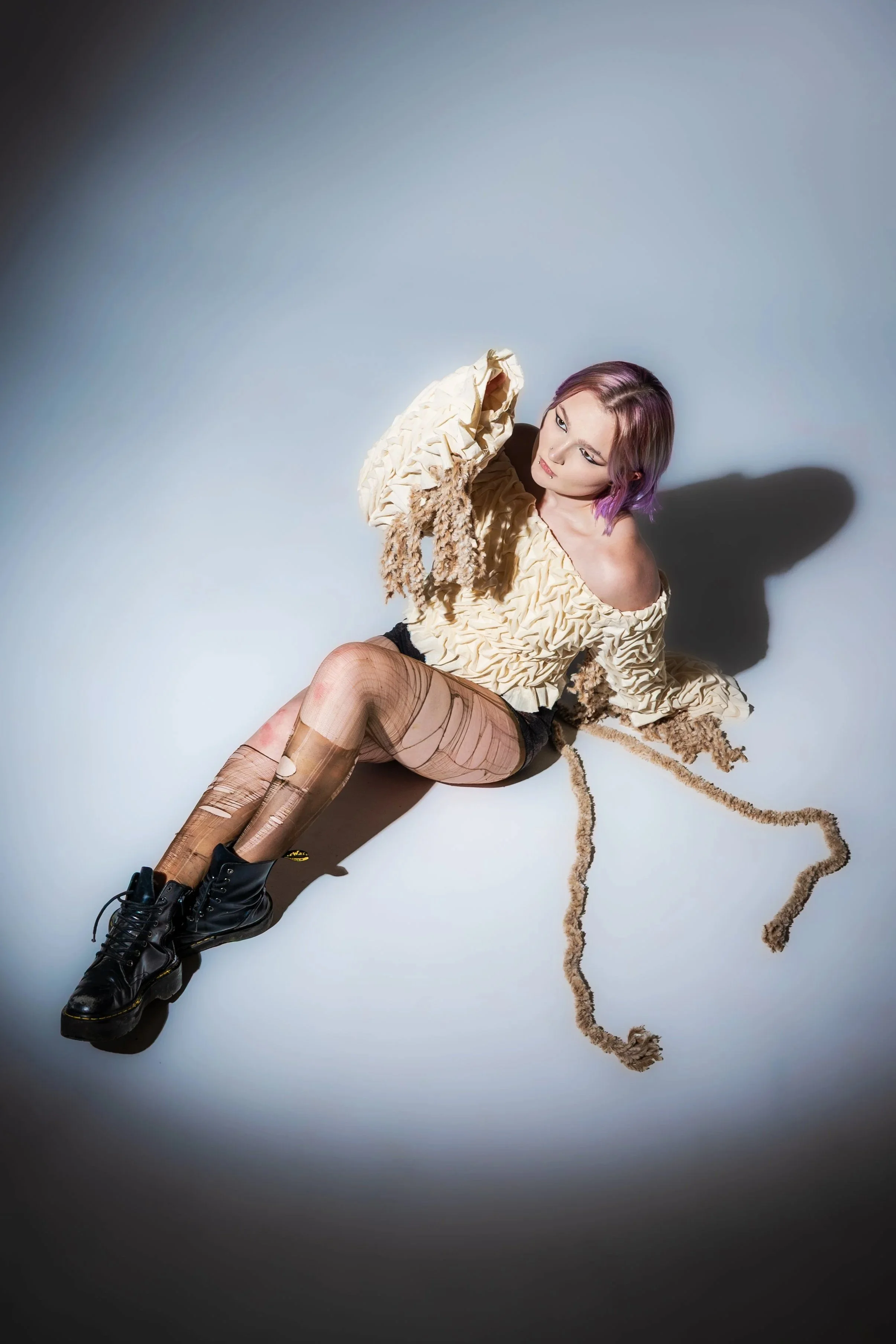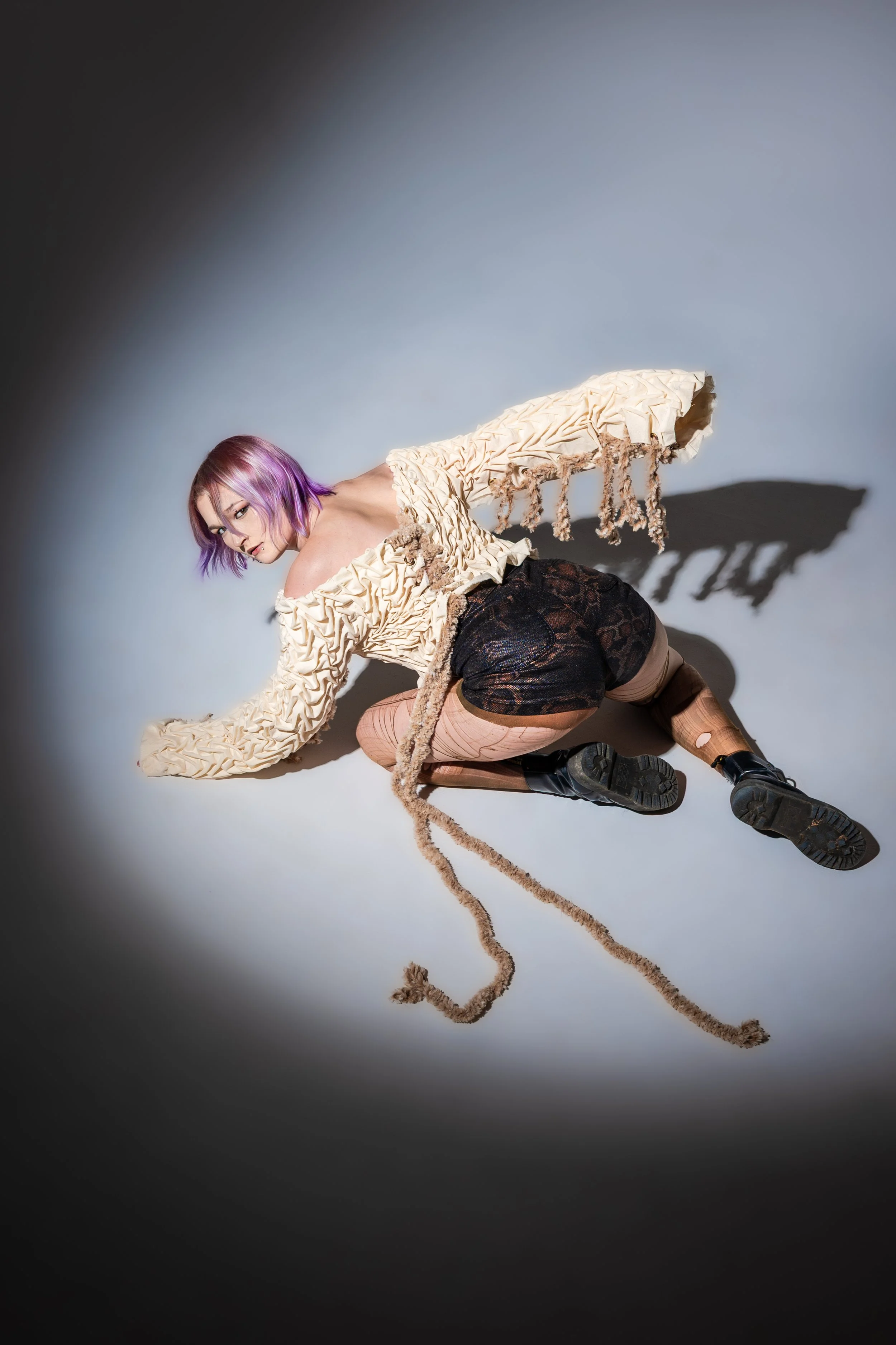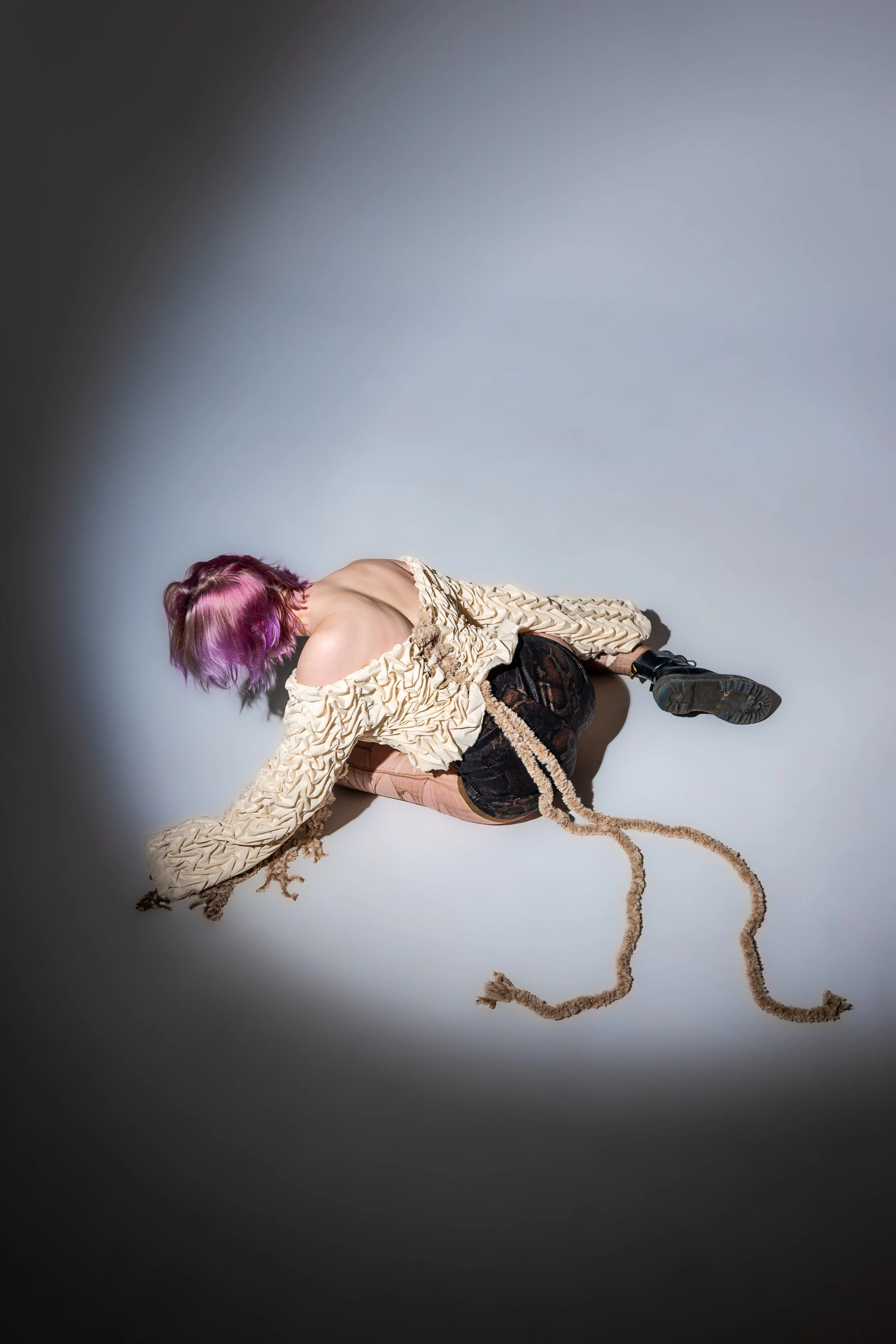 This piece includes smocking, muslin lining, eyelits/grommets, corseted with fur yarn, and superglue (to keep the stitches from popping). While it is not practical to wear due to the limited mobility and discomfort of the superglue, it was a wonderful hands-on experience. This piece was a tedious process but so satisfying to see from start to finish.
